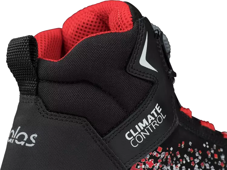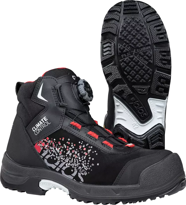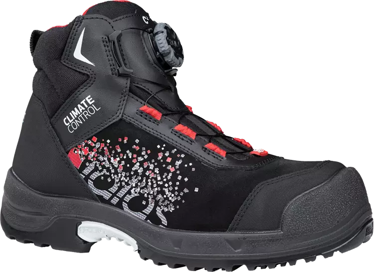 C² Climate Control featuring ventilating air channels, a moisture‑moving lining, and the JALAS® 8217 FX2 Climate insole with Merino wool, conductive fibers, and PORON® XRD® double shock‑absorption zones.