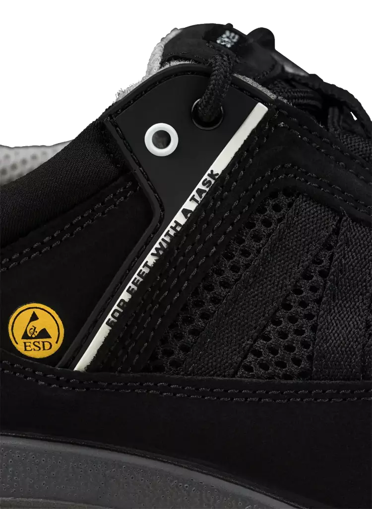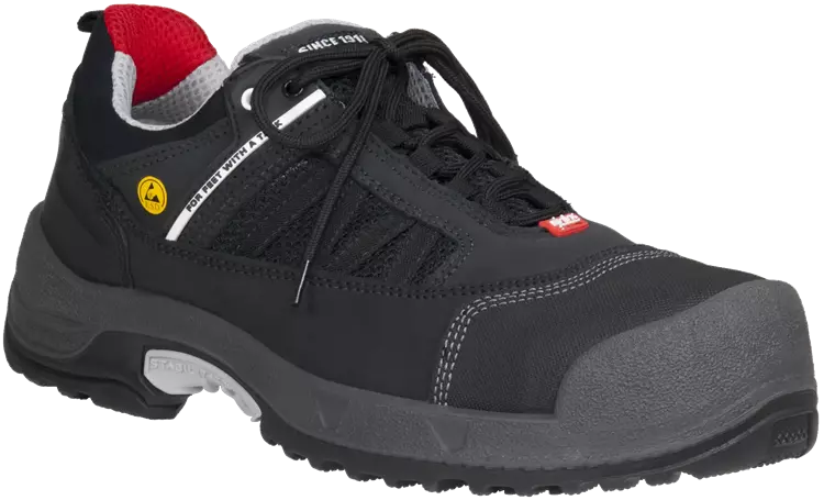 Built‑in safety technologies including anti‑static and ESD properties (IEC 61340‑5‑1 compliant), Ergothan Shock Absorption System, and a stabilizer for improved foot control during movement.