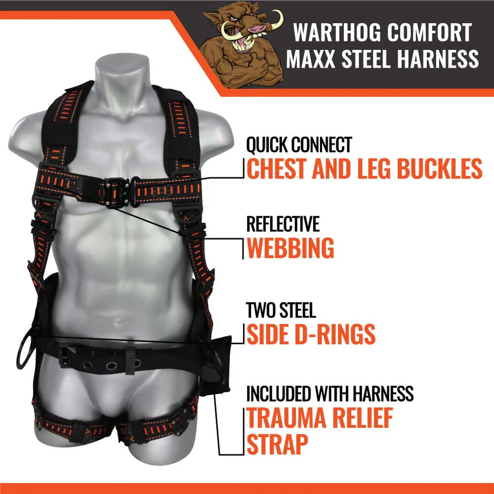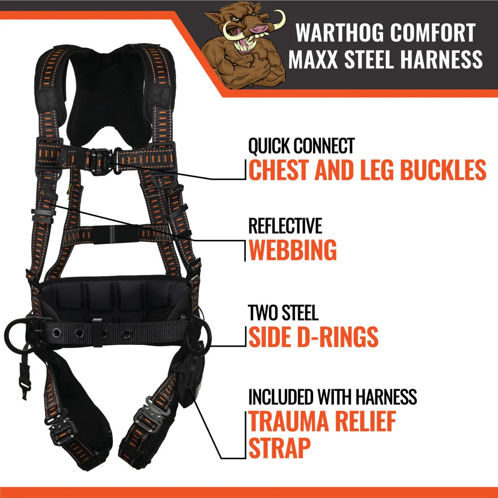 The Warthog® Comfort Maxx Steel Harness is built for crews who need serious comfort and support while carrying heavy tools or working long hours at height. Inspired by the needs of steelworkers, this upgraded version of the original Comfort Maxx adds smarter ergonomics, stronger belt support, and a higher D‑ring position to reduce lower‑back strain. With a rugged build, a trauma‑relief strap, and a dual lifeline attachment point, it delivers dependable protection across construction, industrial, and high‑risk environments.