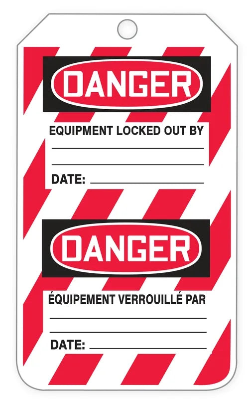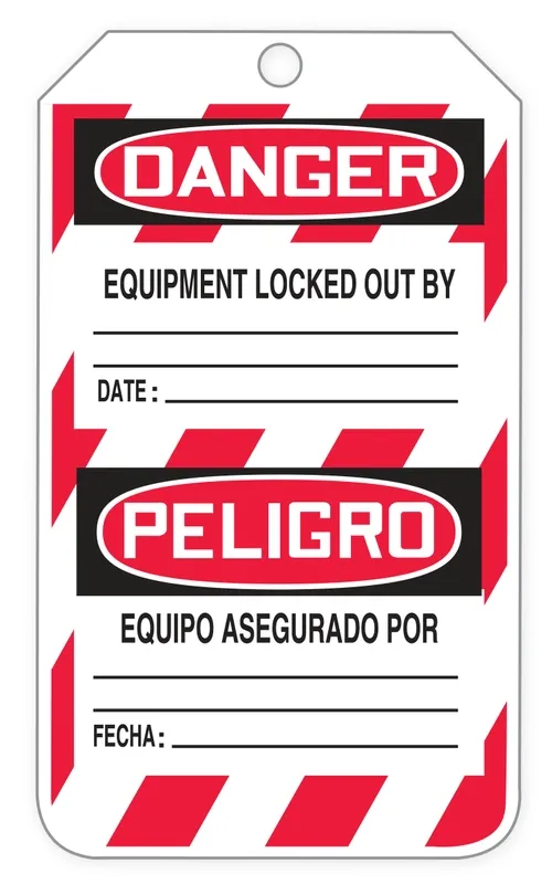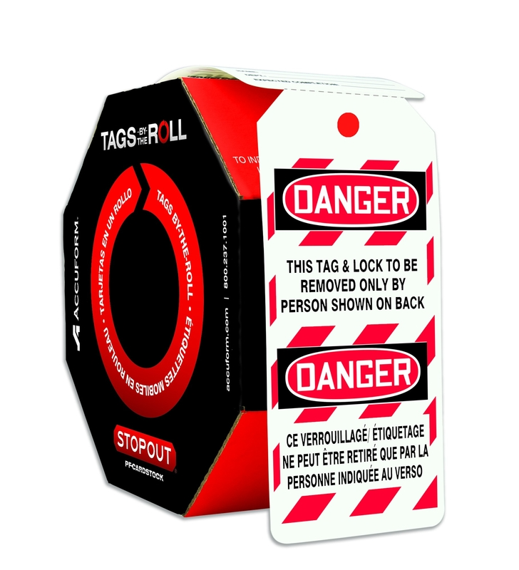 Clearly mark equipment to prevent unauthorized removal with Bilingual OSHA Danger Tags By-The-Roll: This Tag & Lock To Be Removed Only By Person Shown On Back. These tags reinforce critical lockout procedures by identifying the responsible individual in both English and Spanish. Designed for high-use environments, the dispenser keeps tags organized and accessible. Use this solution to maintain compliance and protect personnel in bilingual work settings.