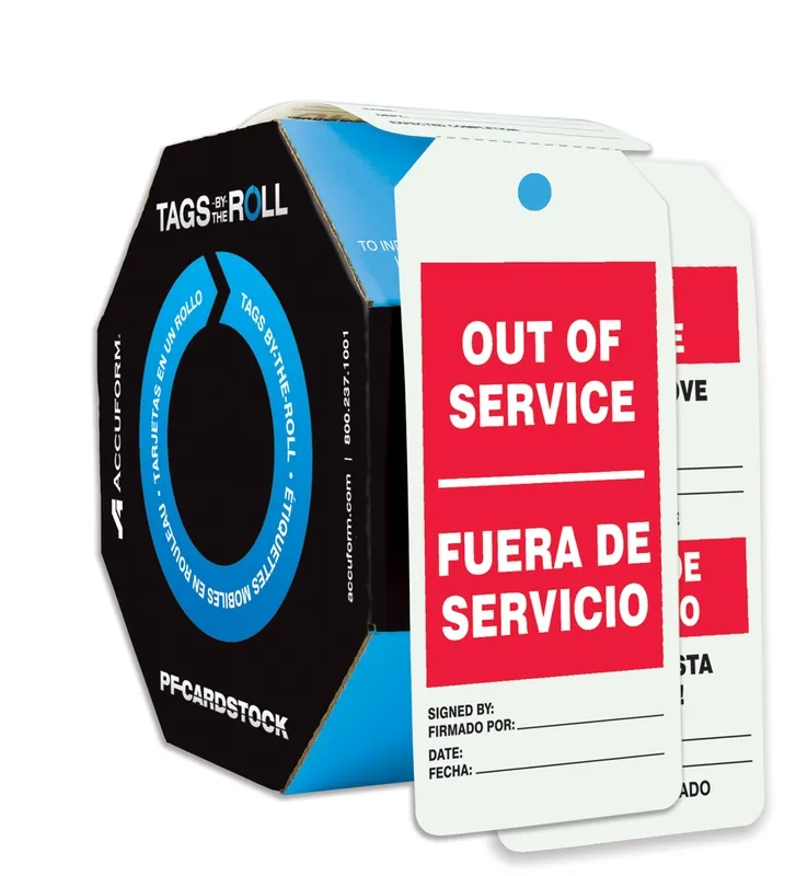 Clearly mark non-functional equipment with the Bilingual Tags By-The-Roll - Out Of Service. These tags help communicate maintenance status in both English and Spanish, ensuring broader workplace understanding and compliance. Ideal for mobile use, the dispenser roll format supports quick, efficient tag deployment across worksites. Constructed from durable PF-Cardstock, these tags are built for visibility and longevity.