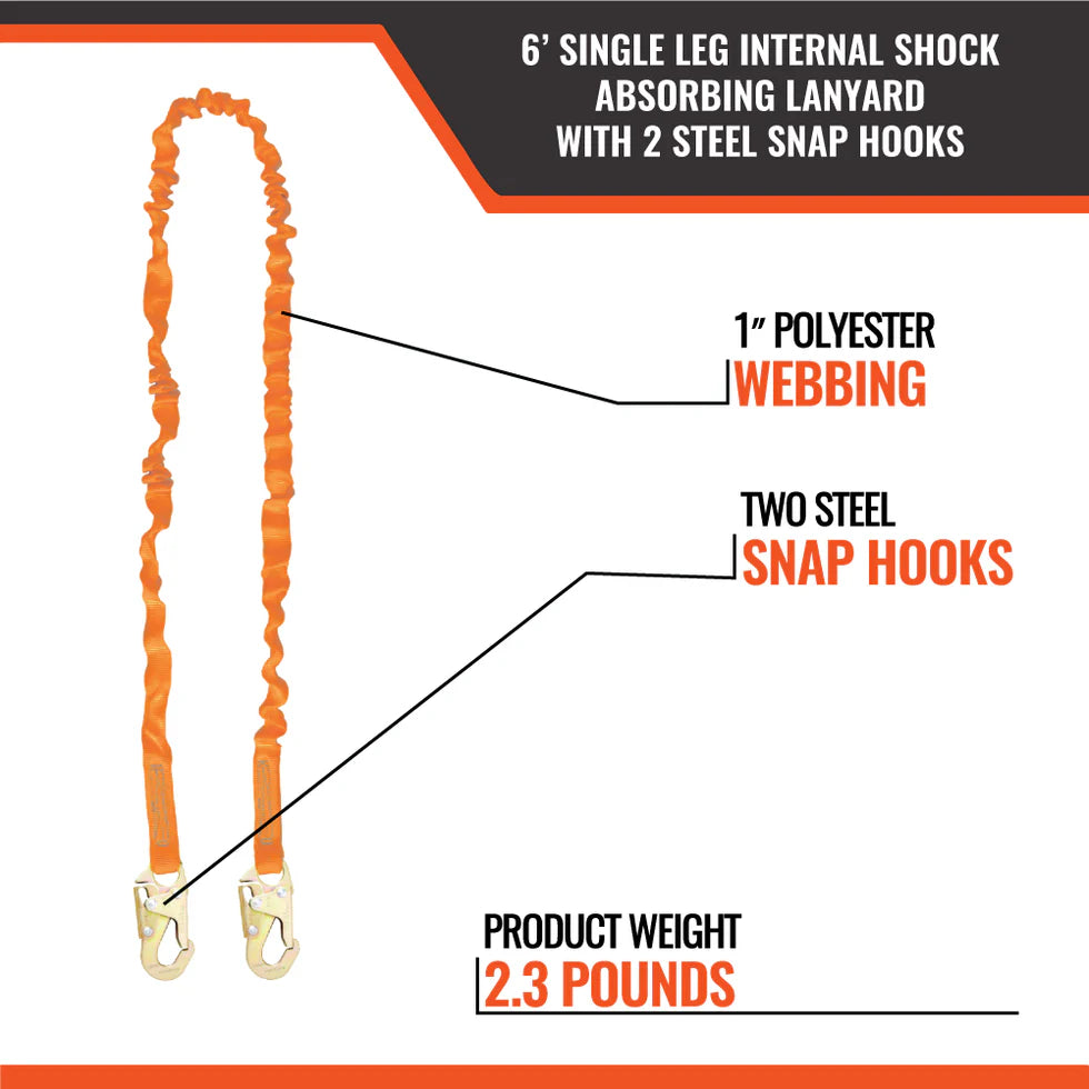 The 6’ Single Leg Internal Shock Absorbing Lanyard with 2 Steel Snap Hooks is built for crews who need a lightweight, durable, and compliant fall‑arrest solution for everyday work at height. With shock absorption built directly into the webbing, it keeps the profile compact while effectively reducing arresting forces during a fall. Designed to meet strict ANSI and OSHA standards, this lanyard delivers dependable performance across construction, roofing, industrial maintenance, and steelwork environments.